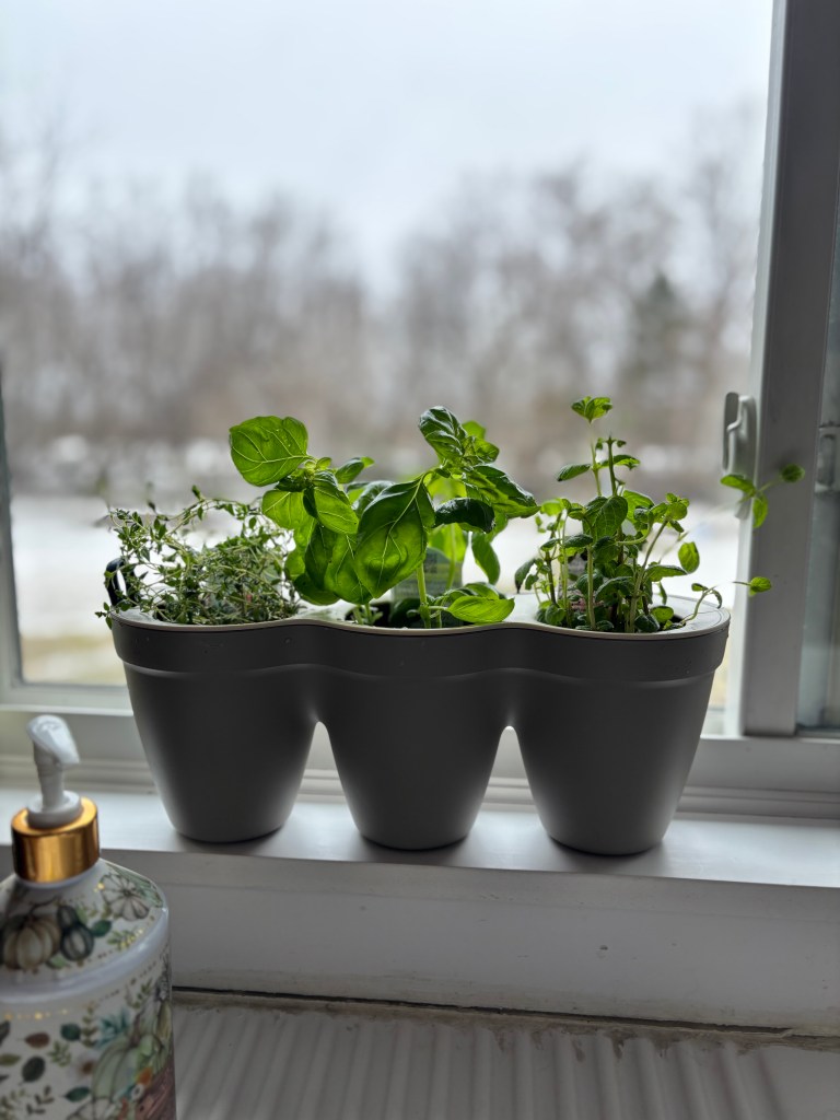 These herbs on my kitchen window sill brighten my spirits.